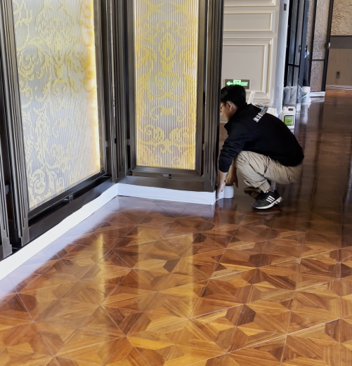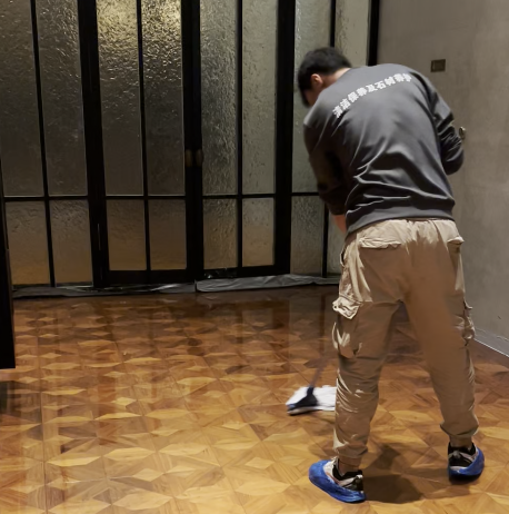 之后就是重要的打蜡过程,我们采用两底两面的顺序,也就是打两遍底蜡,再打两遍面蜡,增加木地板的防水性、耐久性和亮度。