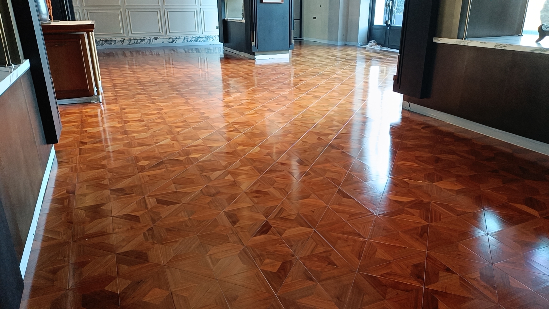 最后,拆除保护膜,物品复位,整个木地板光亮如新,甲方非常满意并发来返图。