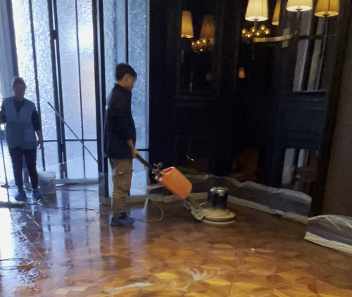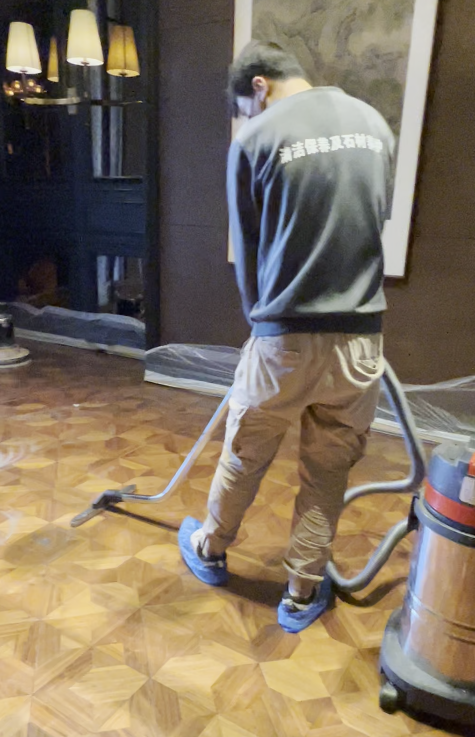近日,南京悦泰-点燃洗护修学院承包了中山国际高尔夫酒店的木地板清洗养护的项目,维护前,甲方木地板磨损较大,蜡面有划痕,非常影响美观和使用效果。