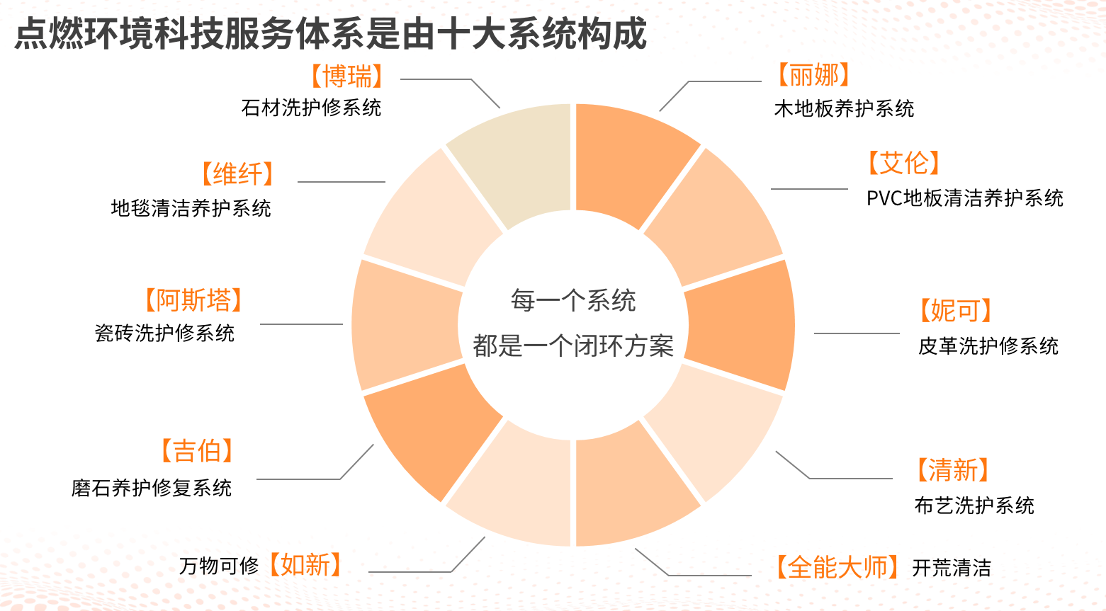 点燃环境科技业务模块共分为三大项:提供企业内训服务;出新维新,定期或长期安排固定员工提供每日或周期性的系统洗护修服务,一次性出新服务,还包括一次性的清洁、养护、修复服务;产品销售,将我们用的好的产品平价销售给客户,免去客户试错成本,帮助客户节约时间。
