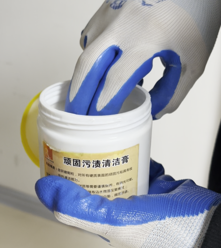 1.油污:局部油污,将强力除油剂原液直接倒在毛巾上擦拭;大面积油污,将除油剂按1:10稀释后,用擦地机加红色洗地垫低速清洁。